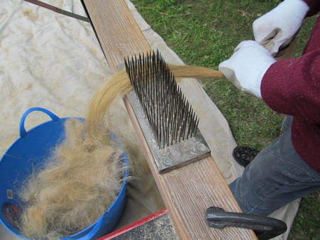 This is the process that prepares the flax for spinning in which it is pulled through various different sized hackles. First it is pulled through a hackle with nails spaced fairly far apart to remove the straw and then the hackles with nails close together would polish and split the fibers. The fibers that come off on the hackle are bundled to provide a lower quality product still of some value, while the hackled flax that remains intact is cleaned once more and achieves a gloss and suppleness which make it ideal for spinning.